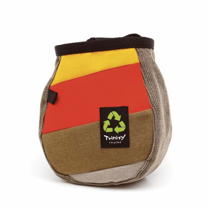 The outer layer of these chalk bags is made from recycled materials, put together in unique combinations of colors, patterns, and textures.